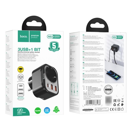 Сетевое зарядное устройство переходник Hoco NS3 USB/ 2 Type-C QC PD 20W 1 розетка черное